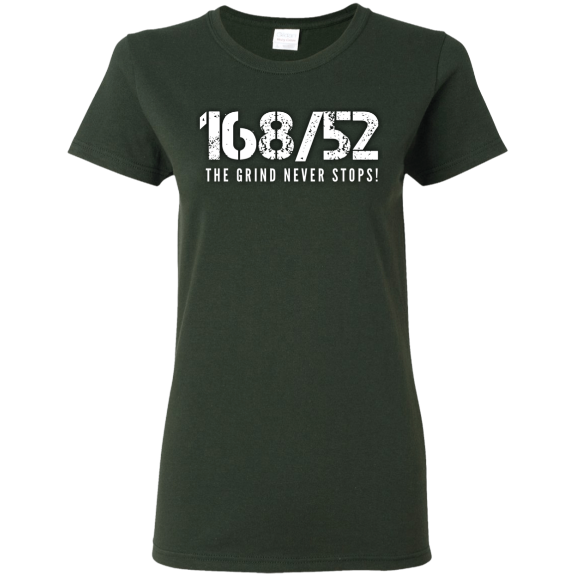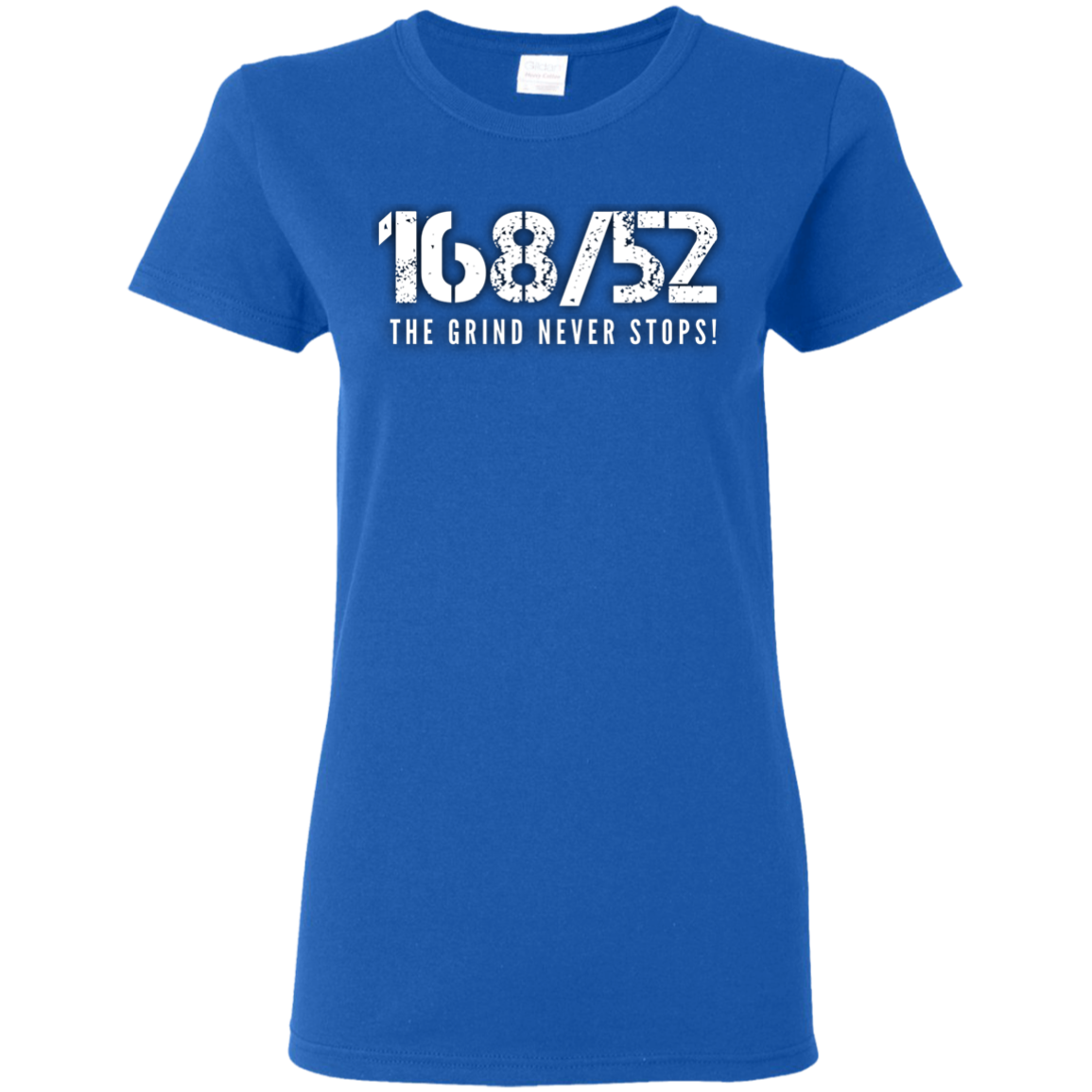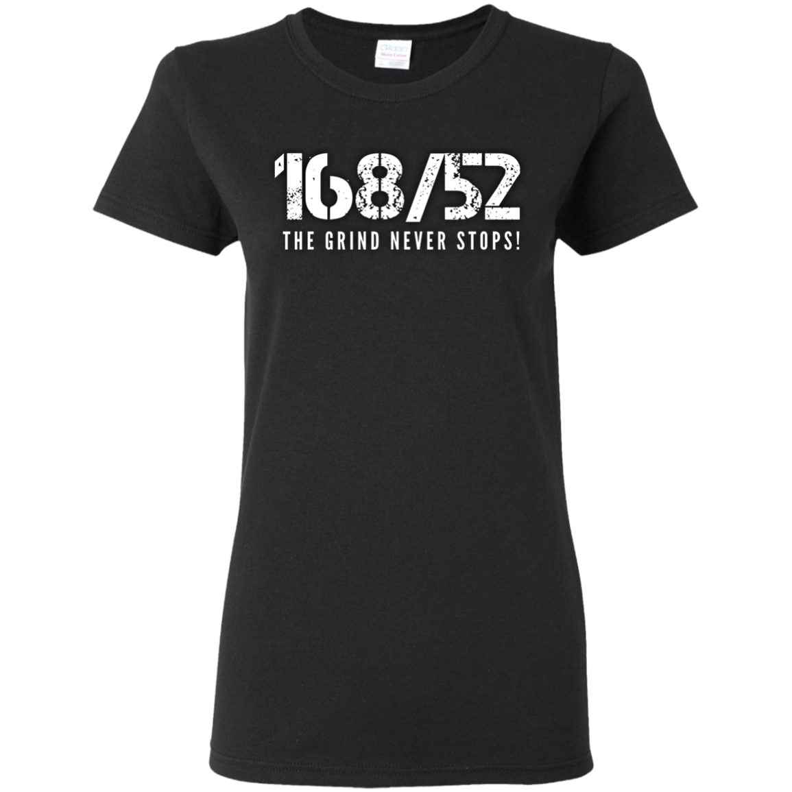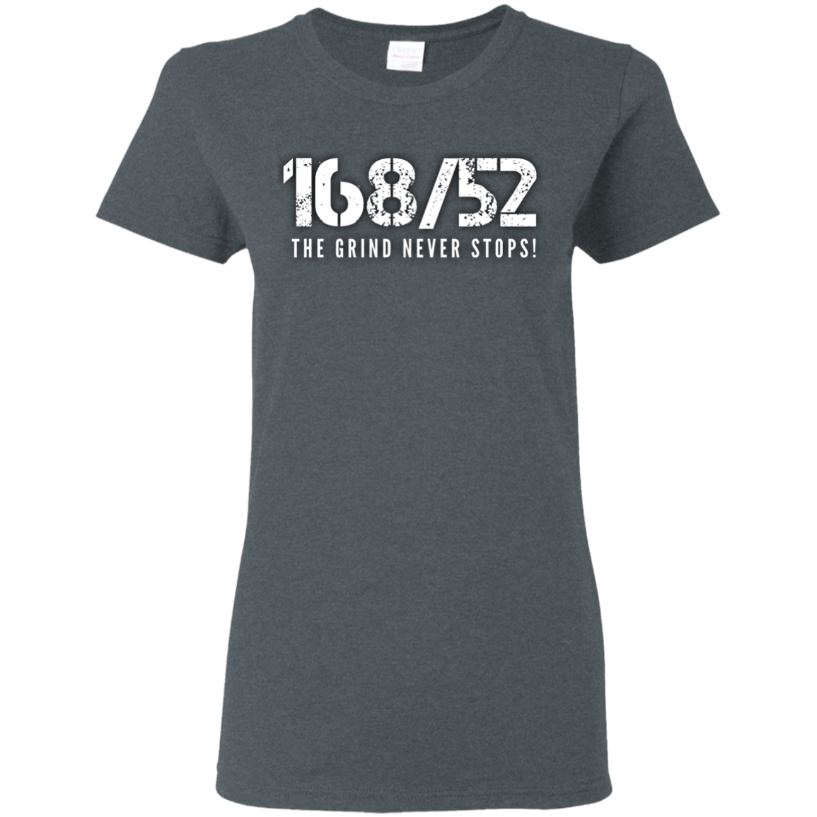 168/52 THE GRIND NEVER STOPS! White print Ladies T-Shirt